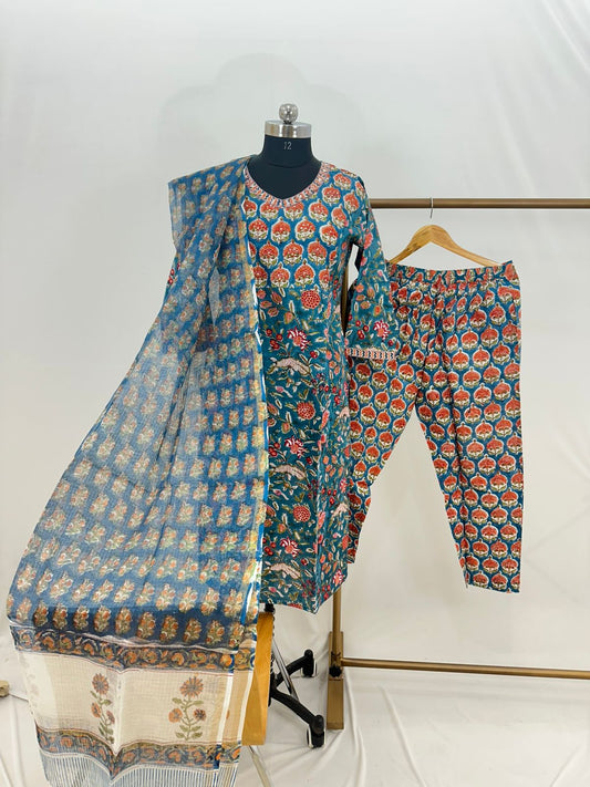 Hand Block Printed Cotton suit with Hand Embroidery - Kurta , Kota Dupatta & Pant - size 36,38, 40, 42, 44, 46, 48