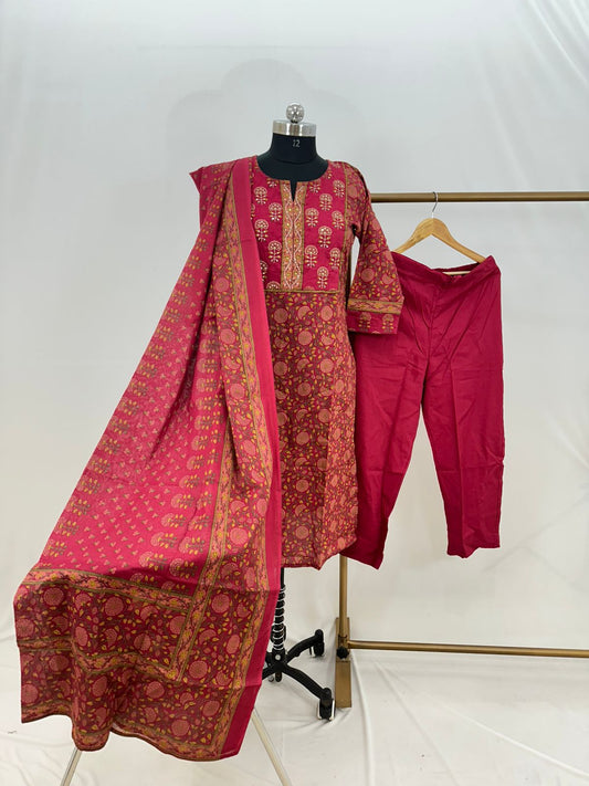 Hand Block Printed Cotton suit with Hand Embroidery - Kurta , Cotton Dupatta & Pant - size 36,38, 40, 42, 44, 46, 48