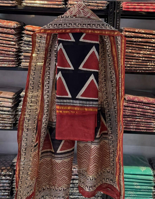 Designer Ajrakh Modal Silk Unstitched suit with panel design, Ajrakh Dupatta & Bottom- 3 piece set