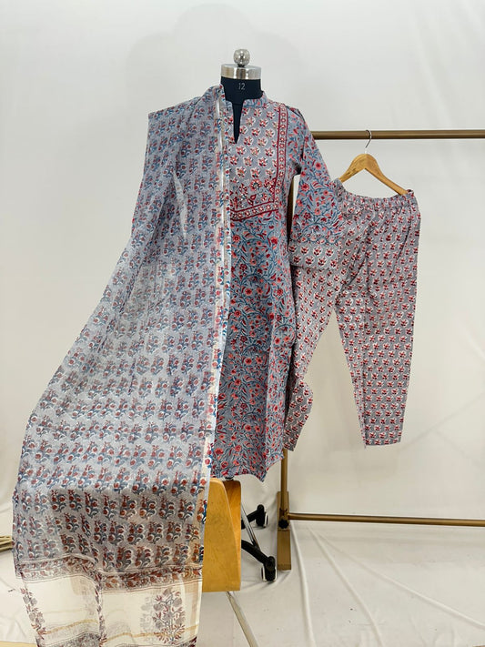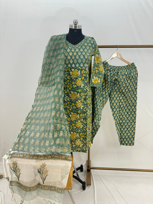 Hand Block Printed Cotton suit with Hand Embroidery - Kurta , Kota Dupatta & Pant - size 36,38, 40, 42, 44, 46, 48