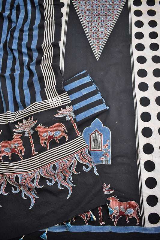 Block Print Ajrakh Cotton Suit with designer Ajrakh neck yoke /panel & Long Stole