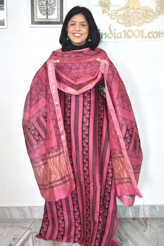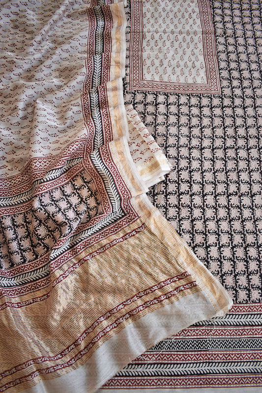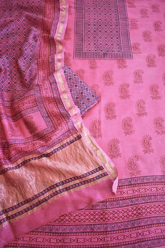 Bagh Hand Block Printed unstitched 3 pcs Handwoven Maheshwari suit fabric with Zari borders