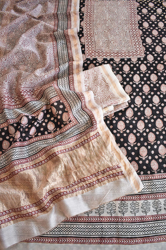 Bagh Hand Block Printed unstitched 3 pcs Handwoven Chanderi suit fabric with Zari borders