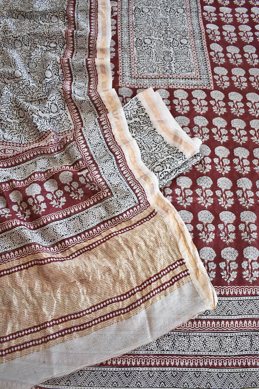 Bagh Hand Block Printed unstitched 3 pcs Handwoven Maheshwari suit fabric with Zari borders & Lagdi ( zari palla )