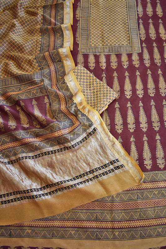 Bagh Hand Block Printed unstitched 3 pc Modal silk suit fabric with Lagdi patta from MP