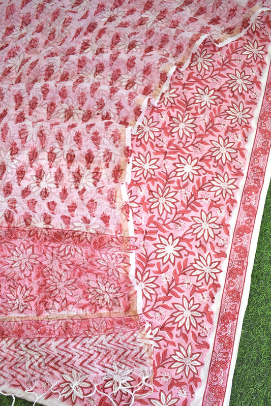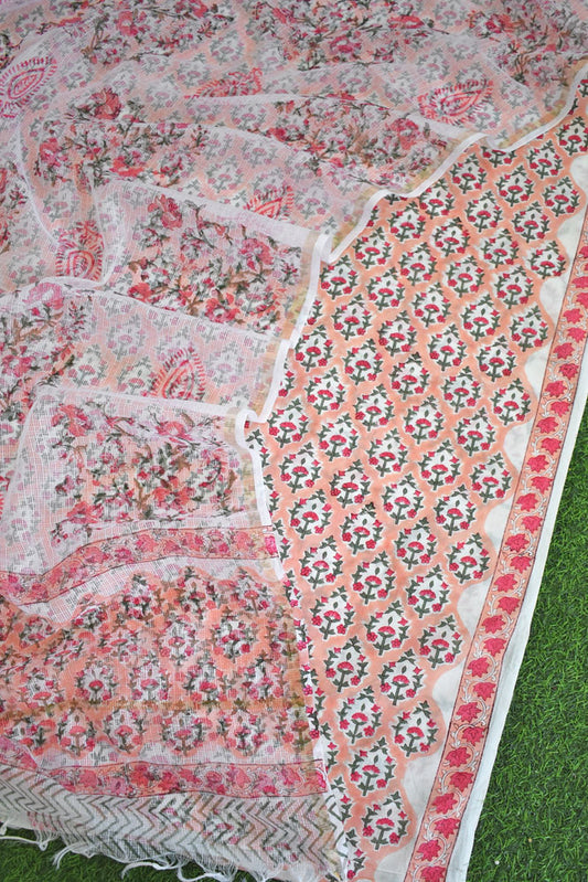 Beautiful Hand Block Printed Cotton unstitched suit fabric with Kota Doria Dupatta