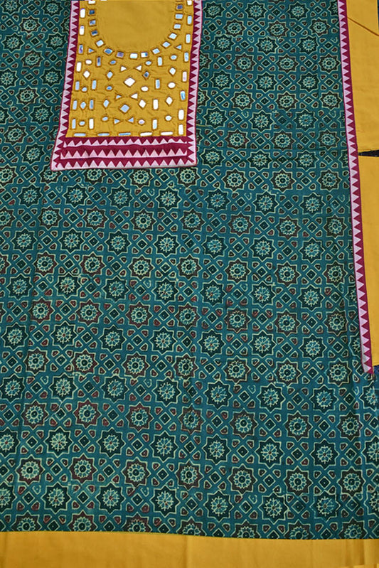 Designer Ajrakh Cotton Short Kurta Fabric with Kutch Mirror Work patch