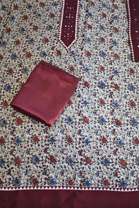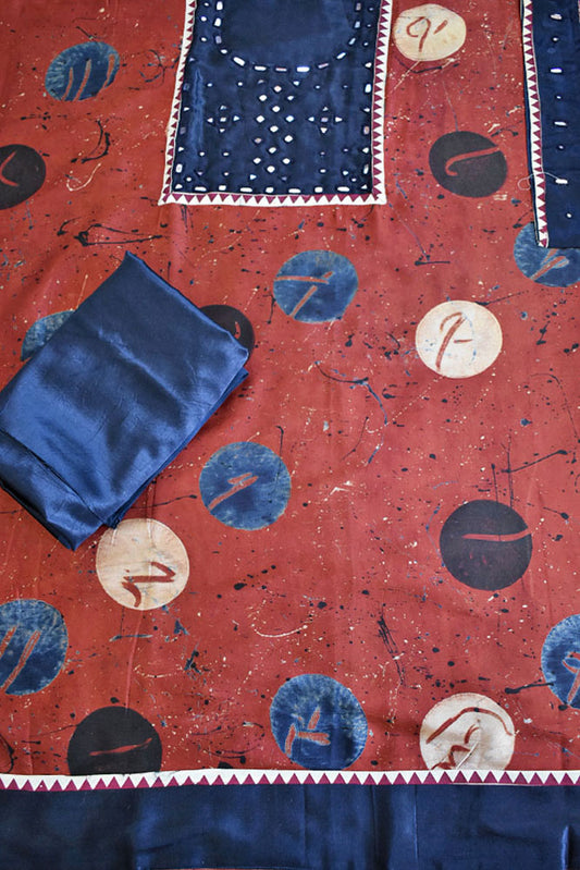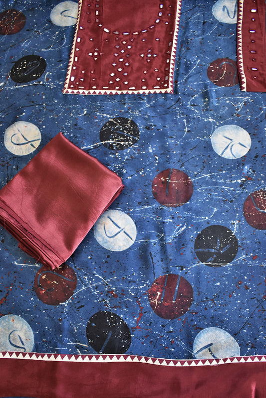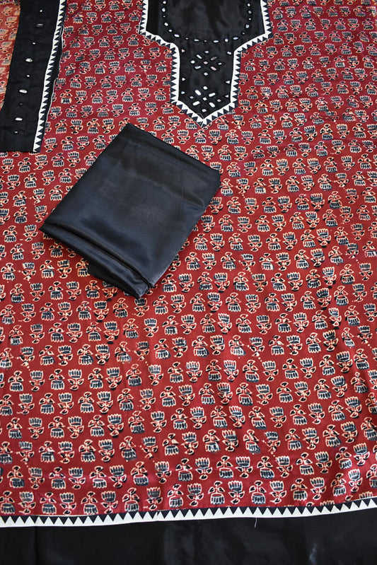 Designer Ajrakh Mashru Kurta Fabric with Kutch Mirror Work patch & Plain Mashru pant fabric