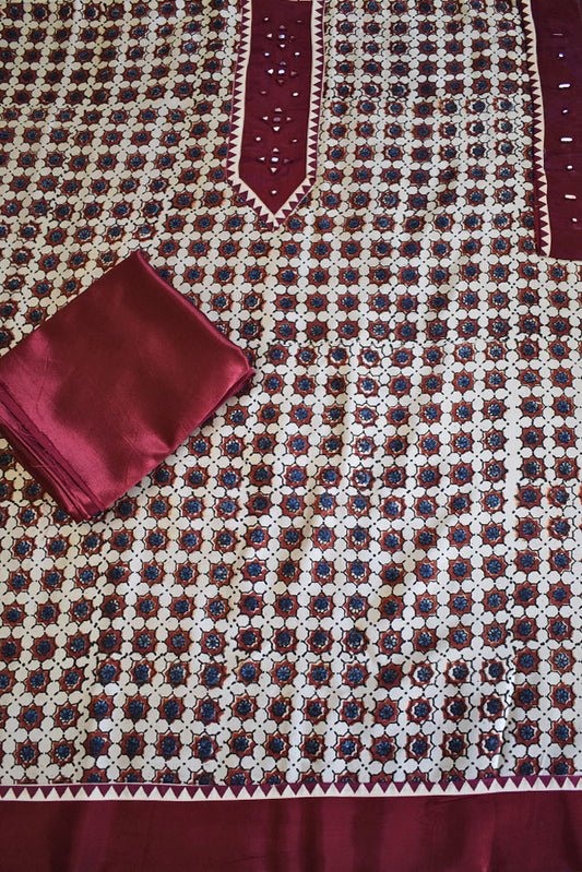 Designer Ajrakh Mashru Kurta Fabric with Kutch Mirror Work patch & Plain Mashru pant fabric