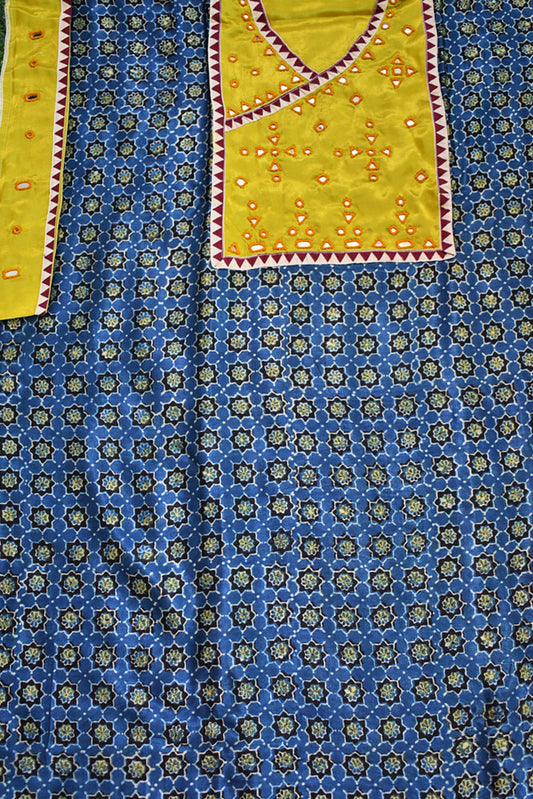 Designer Ajrakh Mashru Kurta Fabric with Kutch Mirror Work patch