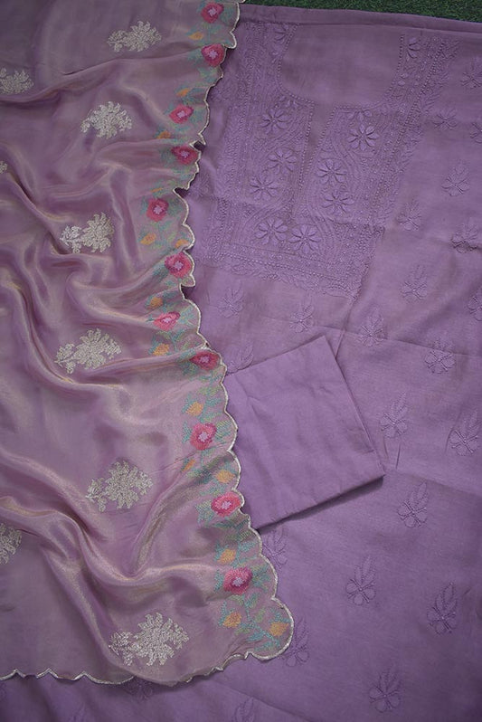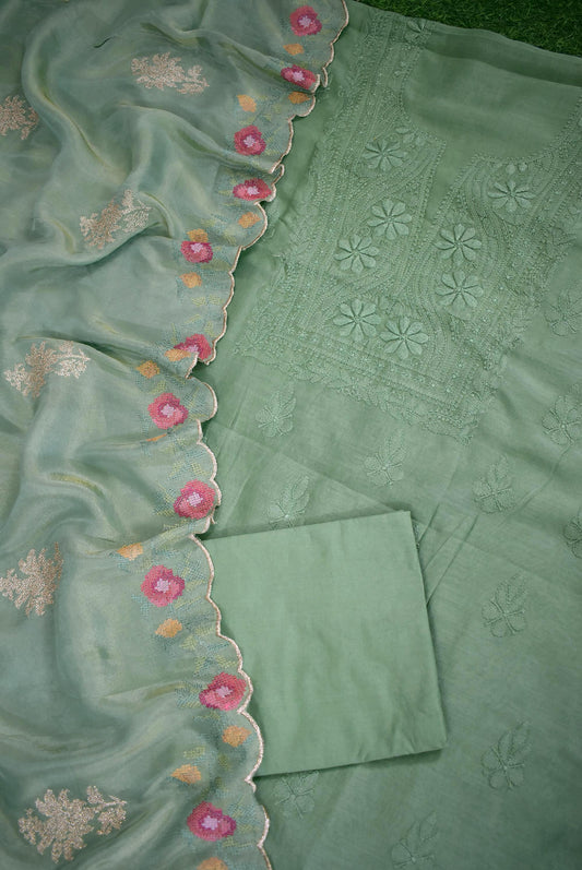 Exquisite Hand Chikankari Chanderi Kurta Fabric with Embroidered Georgette Tissue Dupatta & cotton bottom