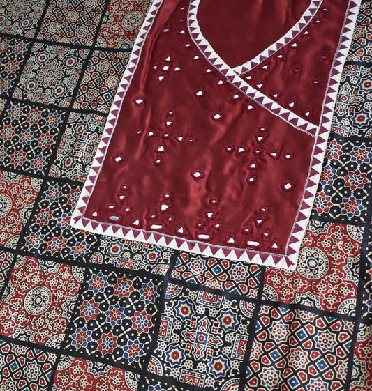 Designer Ajrakh Mashru Kurta Fabric with Kutch Mirror Work patch