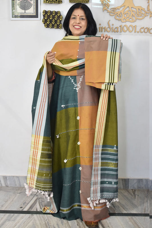 Premium Handwoven Kala Cotton Bhujodi suits with Mirror and Miri work - 3 pc set
