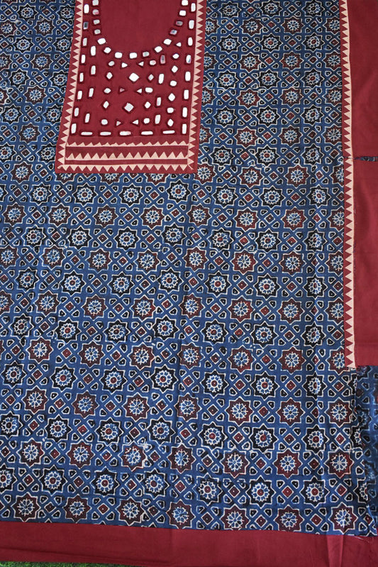 Designer Ajrakh Cotton Short Kurta Fabric with Kutch Mirror Work patch