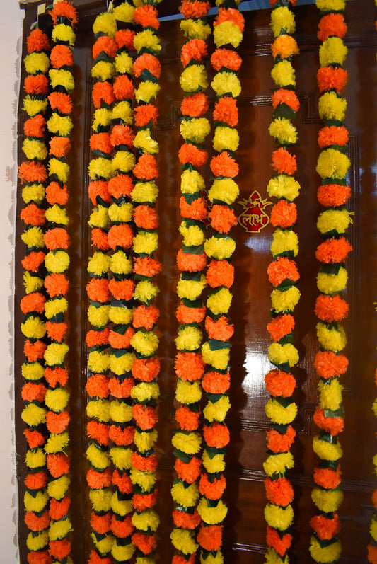 Pack of 5 - Artificial Marigold Flower Garland strings - 4.5 ft + (Orange, Yellow with green leaf )