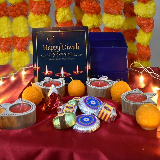 Gift Hamper - Carved Diyas, Cracker Choclates and Laddo Candles Hamper