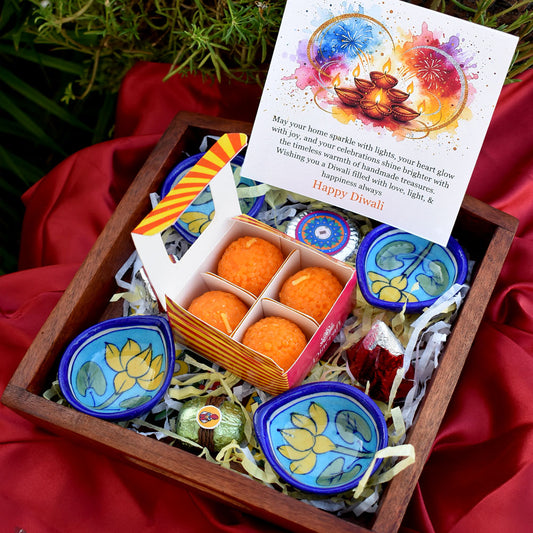 Blue Pottery Hamper - Hand painted Blue Pottery diyas & Laddoo Shaped Candles