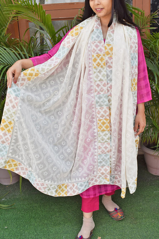 Handwoven Ikkat Cotton Kurta fabric with Kutch Mirror work & Hand Kantha work Cotton dupatta
