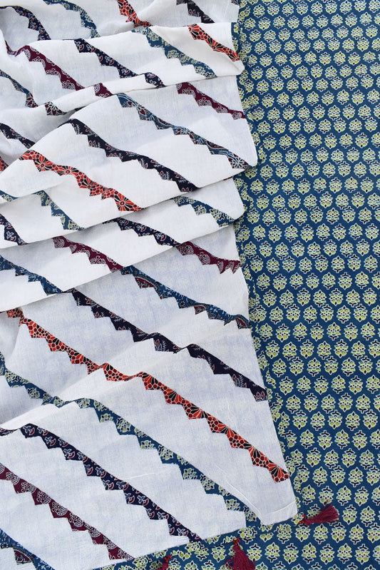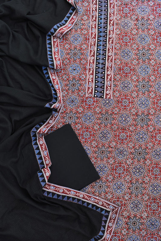 Premium Ajrakh Cotton Unstitched Suit with Ajrakh print & Intricate Hand Embroidery & Pure cotton dupatta with stitched borders