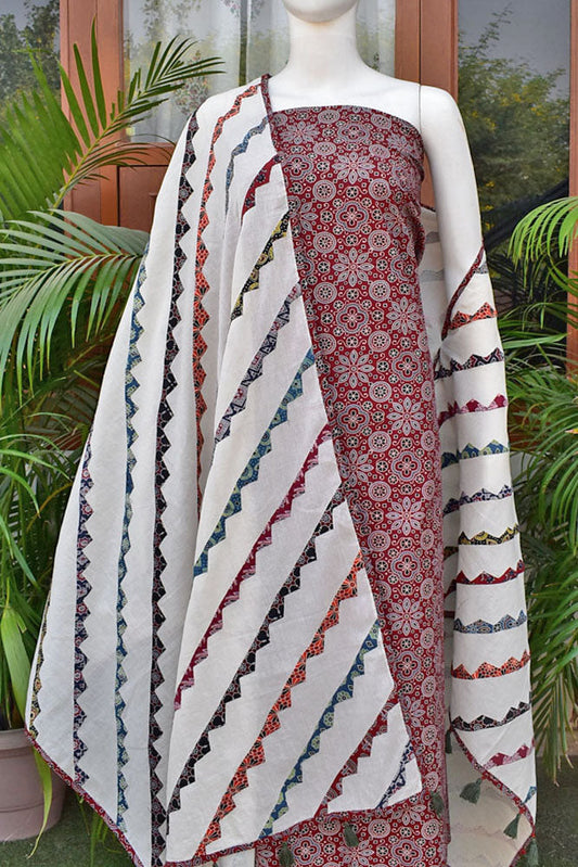 Beautiful Ajrakh Cotton Kurta fabric with Heavy Hand Applique Work dupatta