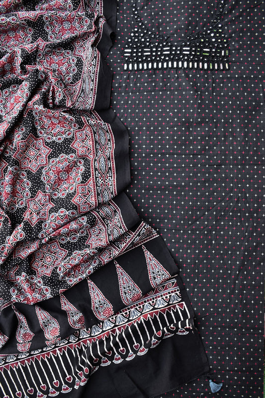 Handwoven Cotton Kurta fabric with Kutch Mirror work & Ajrakh Cotton Dupatta