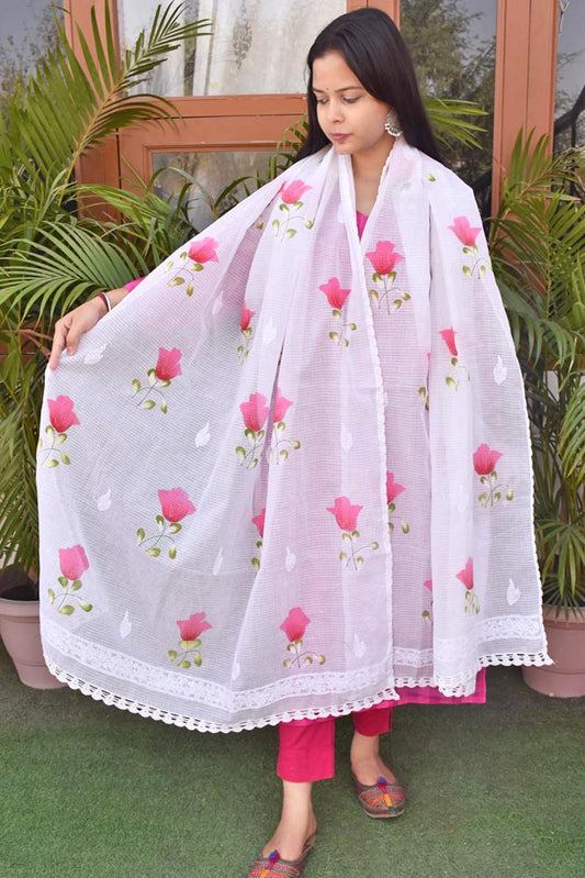 Kota Cotton Dupatta with Hand Paint, Hand Chikankari embroidery & crochet borders on all sides