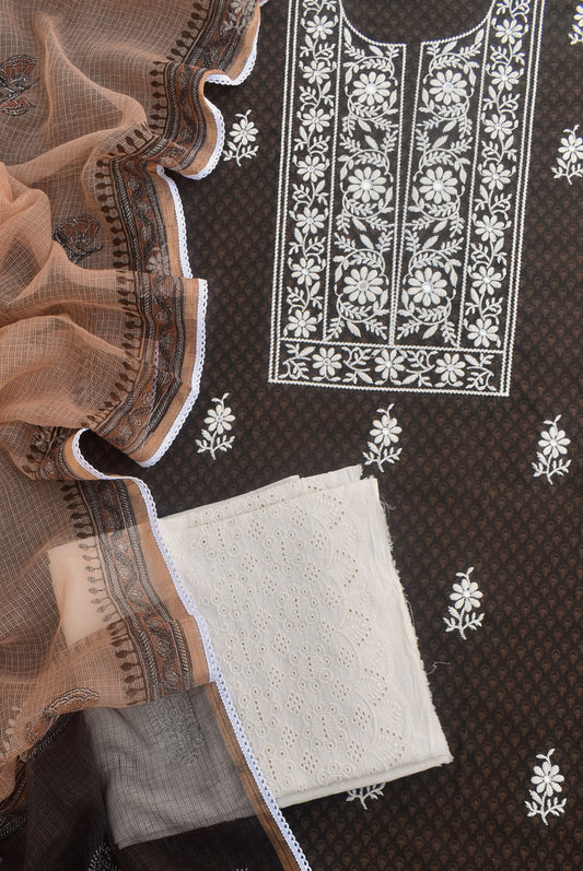Beautiful Cotton Unstitched Suit Fabric with Embroidery work, Lace Detailing, Schiffli work bottom & & Kota Dupatta dupatta