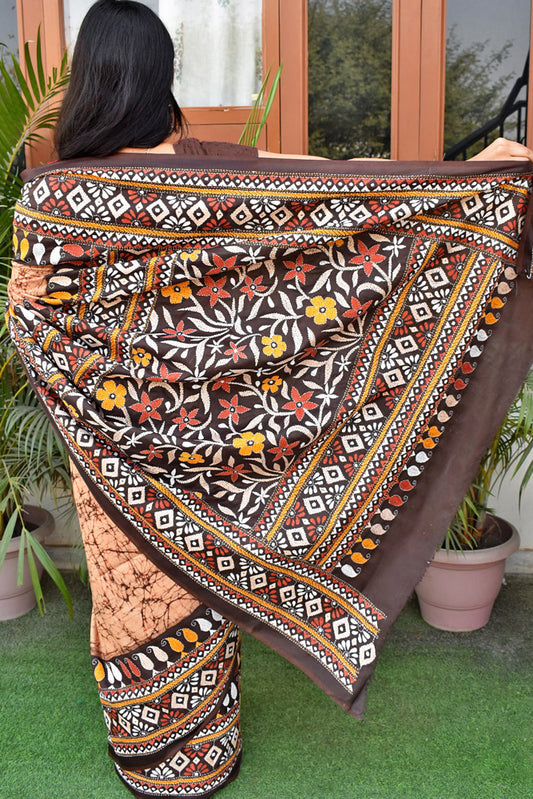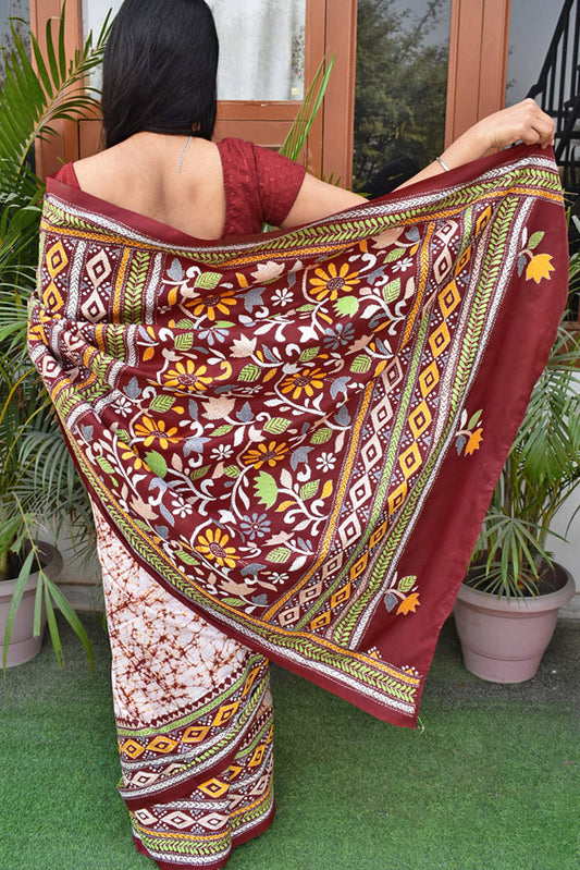 Hand Embroidered Kantha work & Wax Batik Bangalore Pure Silk saree