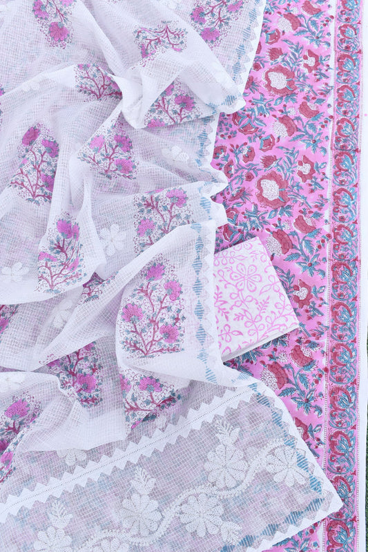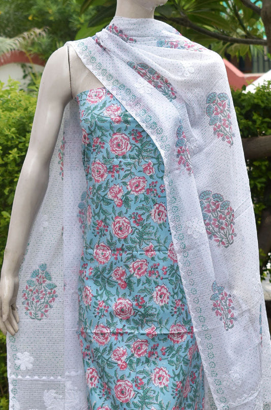 Exquisite Cotton unstitched suit with Block Printed Kota dupatta with Hand Chikankari embroidery