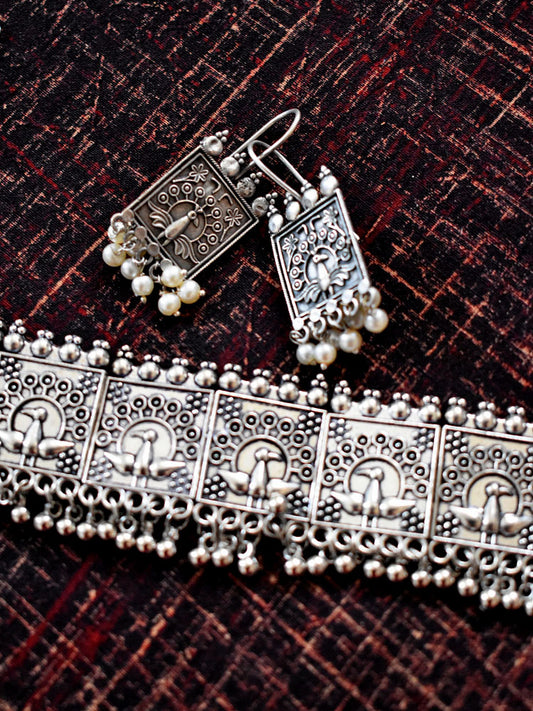 Mayura - Beautiful Antique finish German Silver Necklace with earrings