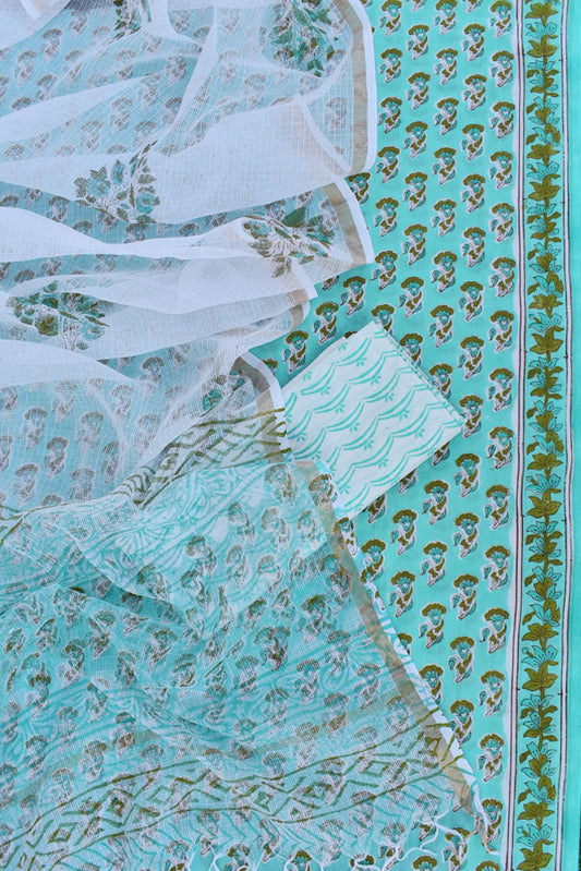 Beautiful Hand Block Printed Cotton unstitched suit fabric with Kota Doria Dupatta
