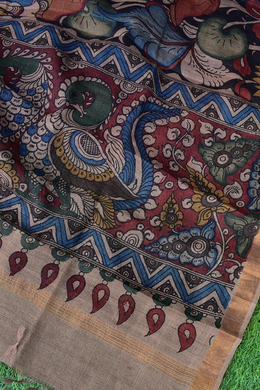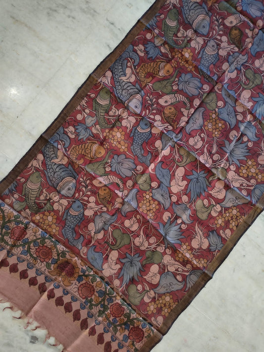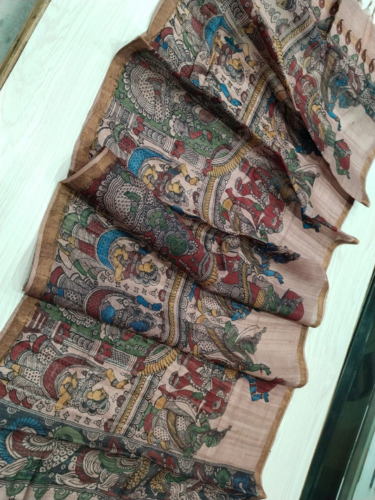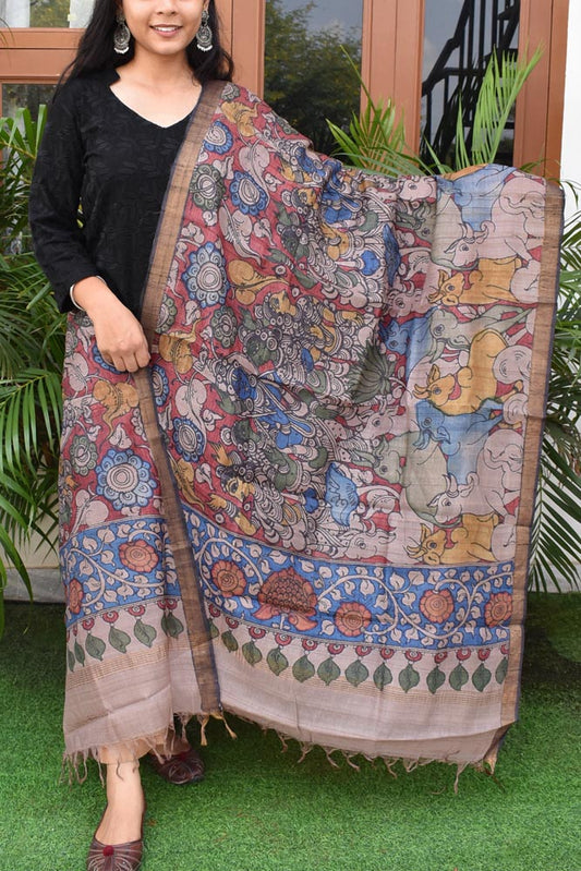 Earthy Hand Painted Kalamkari Desi Tussar Silk Dupatta