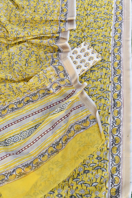 Beautiful Hand Block Printed Maheshwari Silk Cotton Unstitched suit fabric - 3 pc set