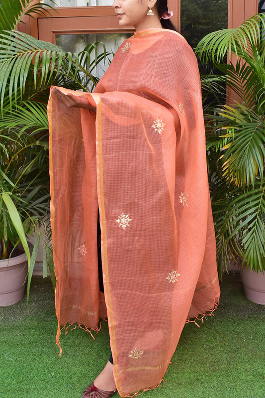 Elegant Peach Organza dupatta with All over Cross Stitch Embroidery