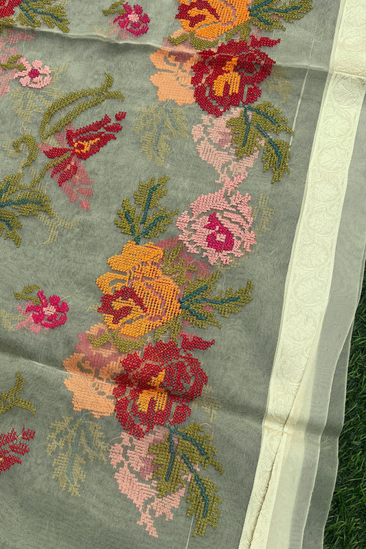 Elegant Cream with Lime tint Organza dupatta with All over Cross Stitch Embroidery