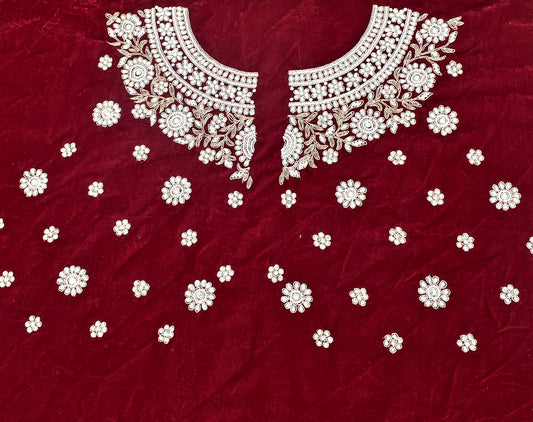 Maroon - Velvet Fabric with Heavy Hand Zardozi, Pearl, Dabka & Kundan Work Embroidery