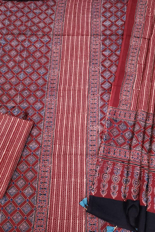 Hand Block Print Ajrakh Cotton Suit with designer Ajrakh neck yoke pattern