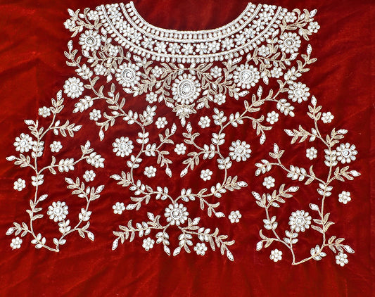 Red -Velvet Fabric with Heavy Hand Zardozi, Pearl, Dabka & Kundan Work Embroidery