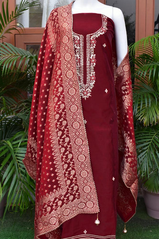 Beautiful Chanderi unstitched suit fabric with Banarasi Dupatta & Matching Potli bag