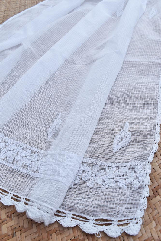 Handcrafted Kota Cotton Dupatta with Chikankari embroidery & crochet borders- base white color - Dyeable