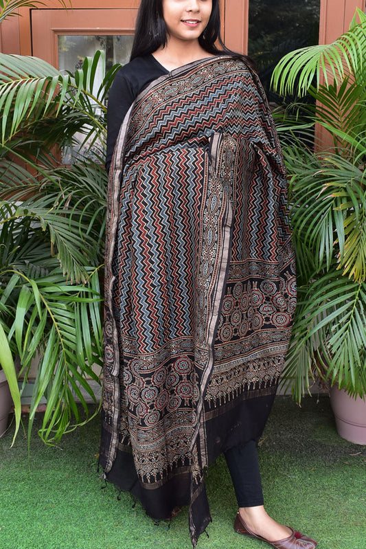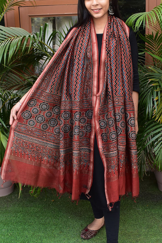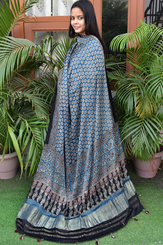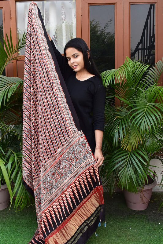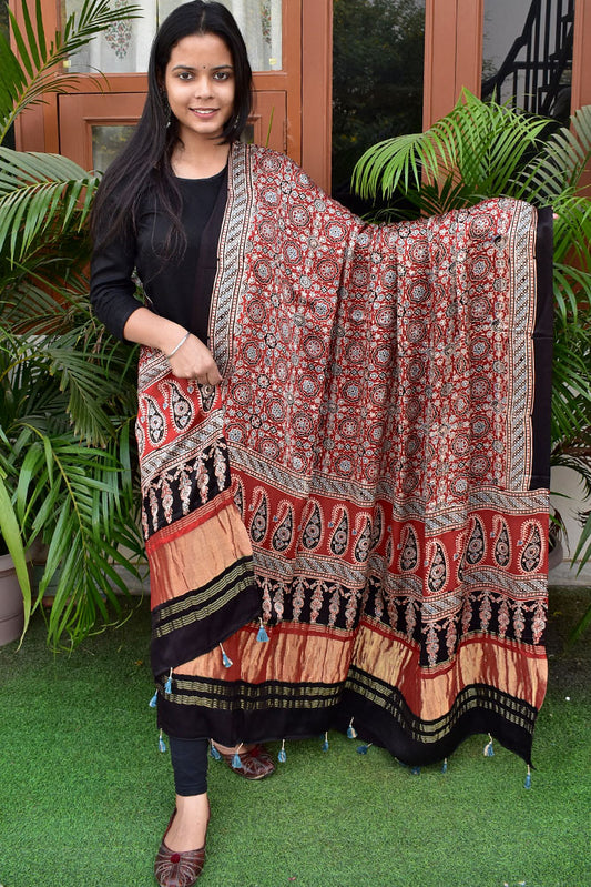 Elegant Modal Silk Ajrakh Block Print Dupatta with zari lagdi patta palla & Tassels