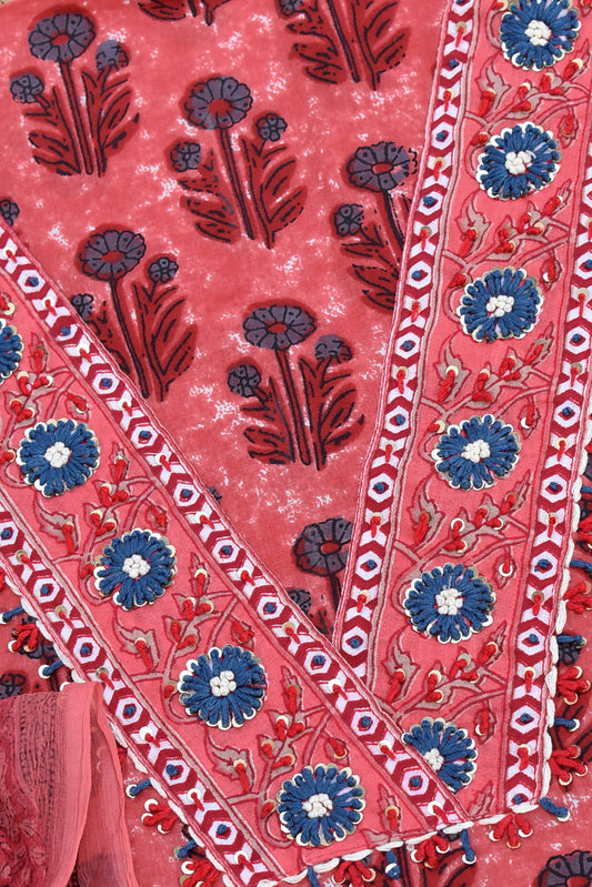 Premium Dabu Ajrakh Cotton Unstitched Suit with Intricate Hand Embroidery, mirror & sequin work & chiffon dupatta