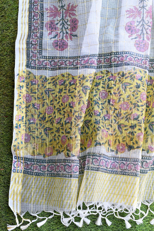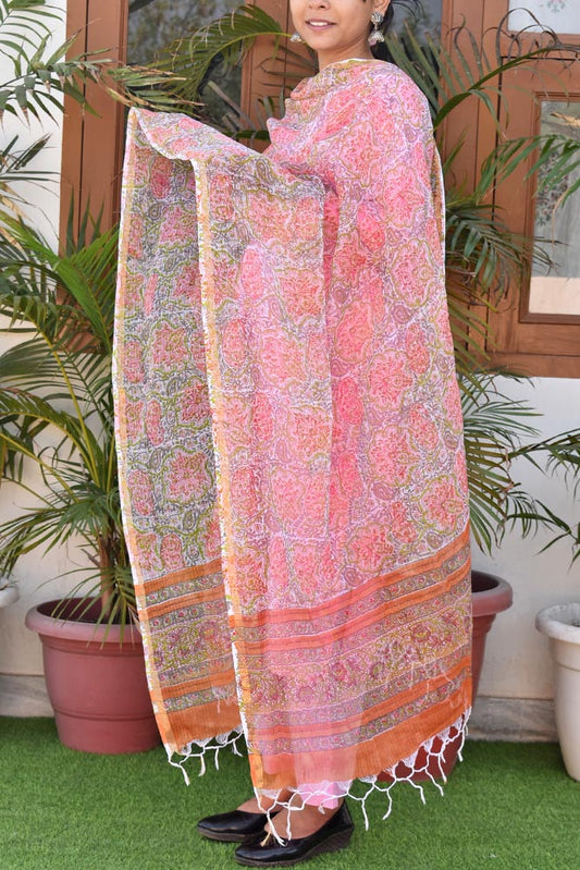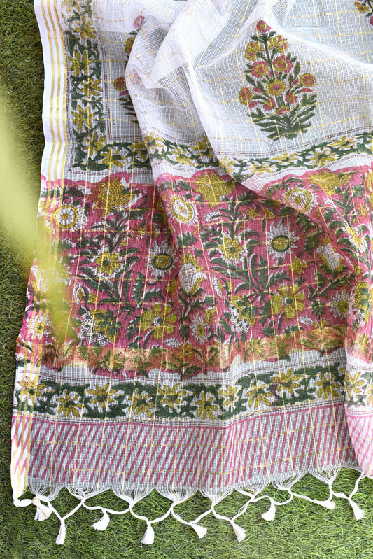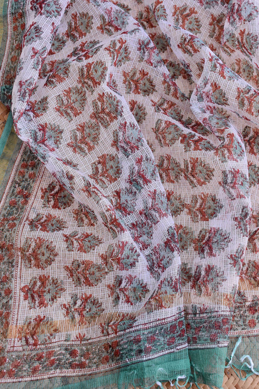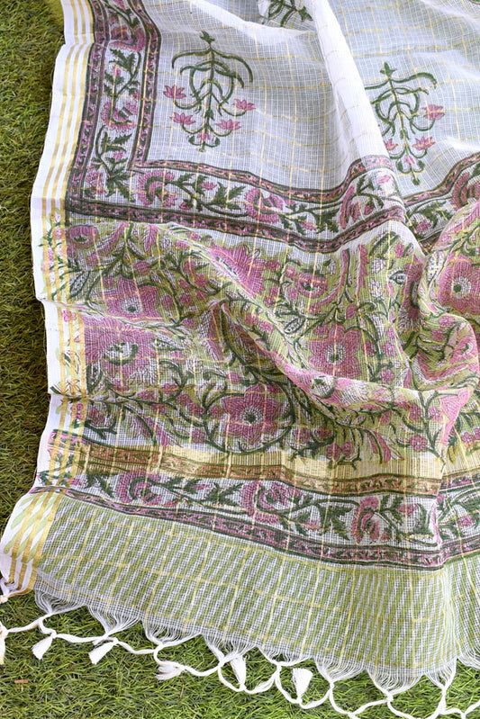 Beautiful Hand Block Printed Kota Doria Dupatta with zari checks and zari border