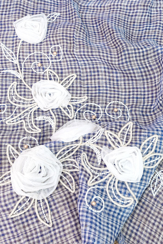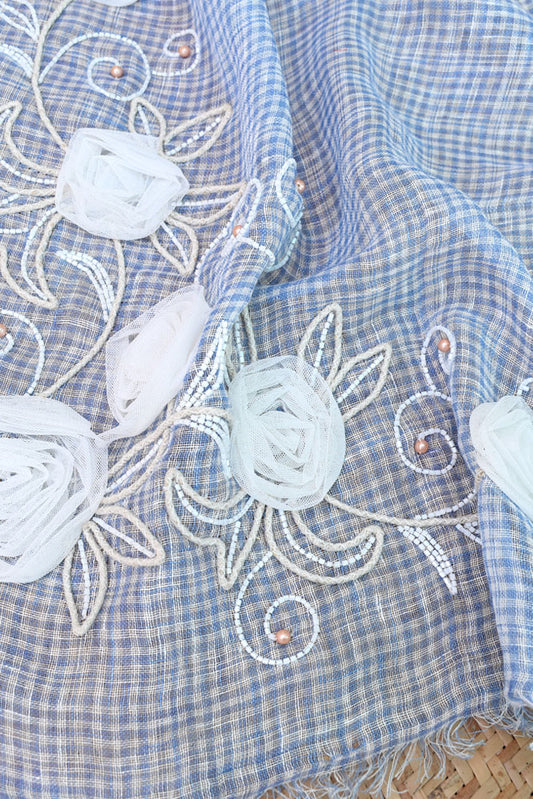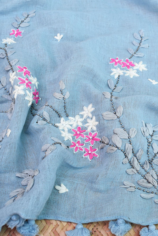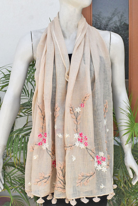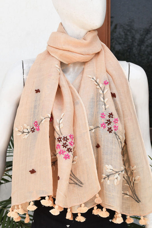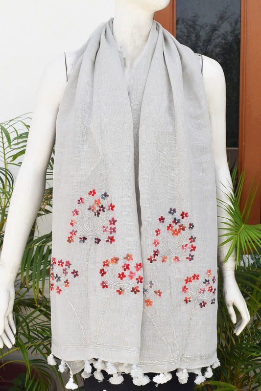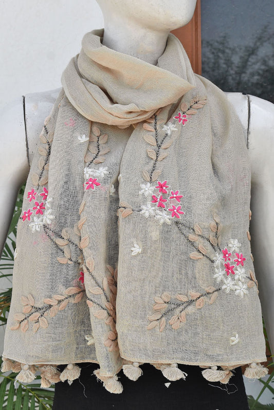 Beautiful Linen Stole with hand embroidery, embellishments & tassels