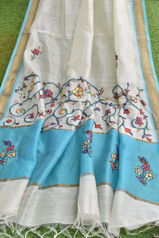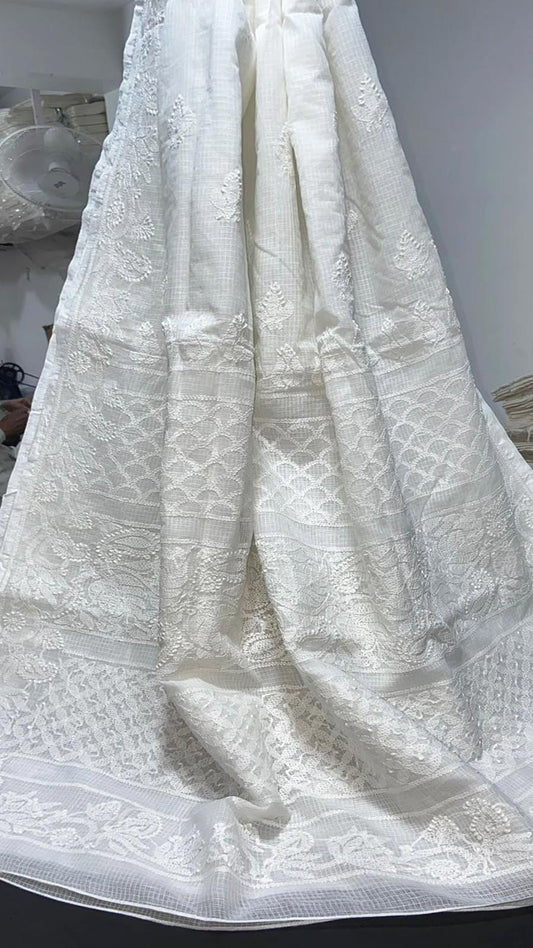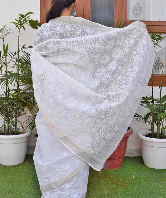 Milky white Kota cotton Saree with zari border & Hand Tepchi work / Lucknowi Chikan work ( with BP)