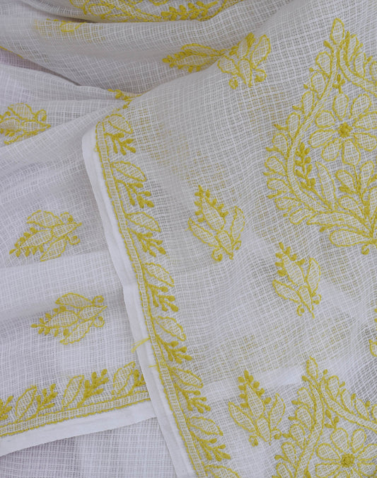Summer Sorbet : Kota Cotton Dupatta with Hand Chikankari embroidery & crochet borders - Light Lemon Yellow