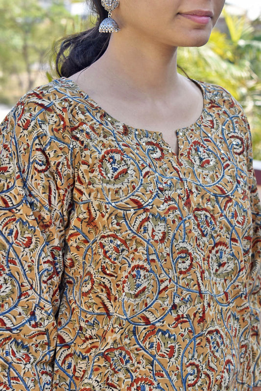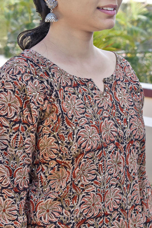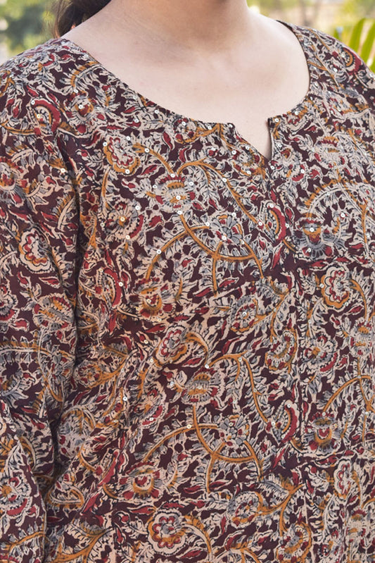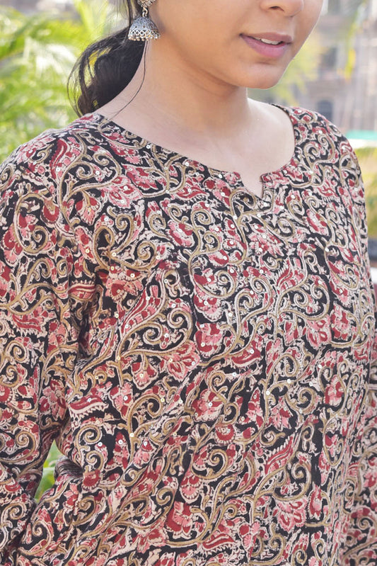Machalipatnam Kalamkari Hand Block Printed Cotton Short Kurta with sequins on yoke - Size - 36, 38