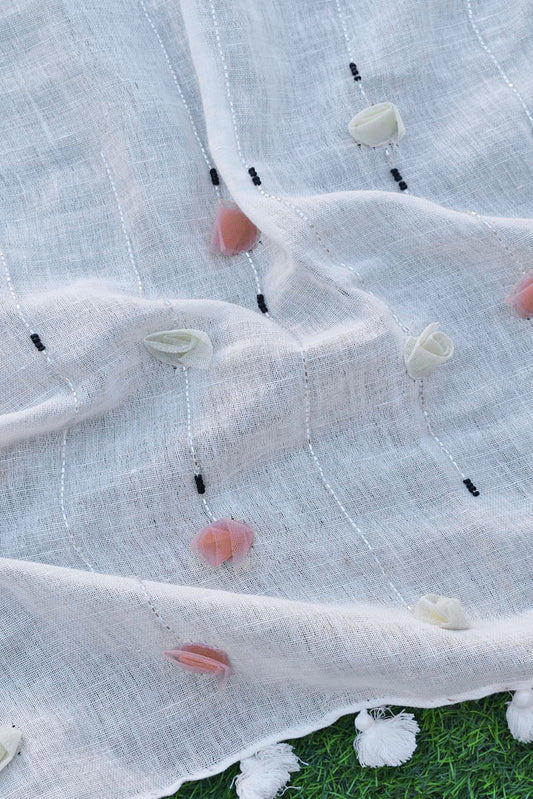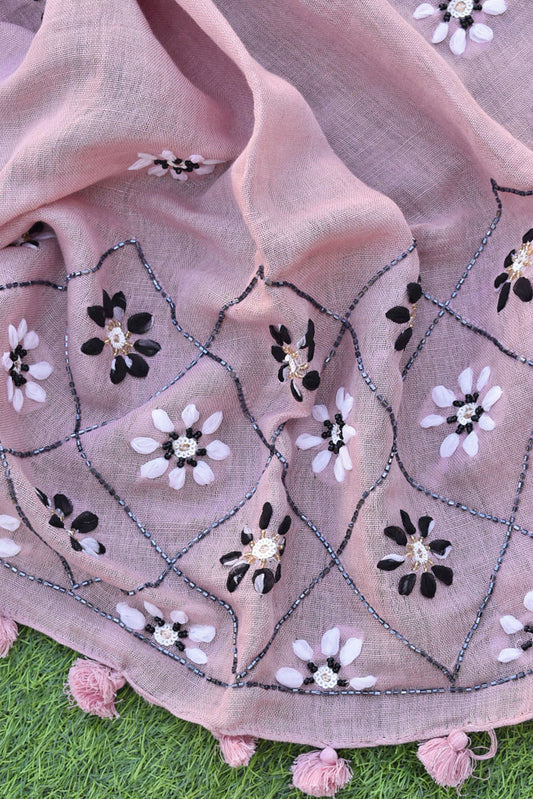 Beautiful Linen Stole with hand embroidery, embellishments & tassels