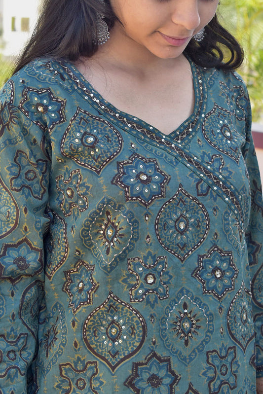 Machalipatnam Kalamkari Hand Block Printed Cotton Short Kurta with sequins on yoke - Size -38