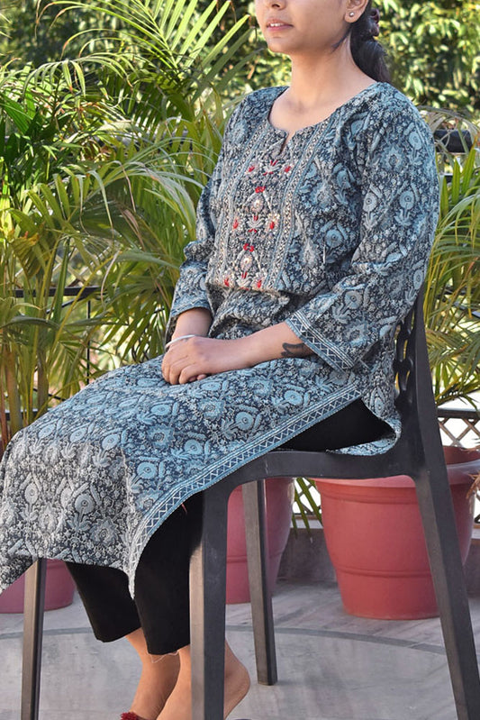 Beautiful Cotton Kurta with Hand Tagai Embroidery & Aari work & Embroidered Sequins Size - 38